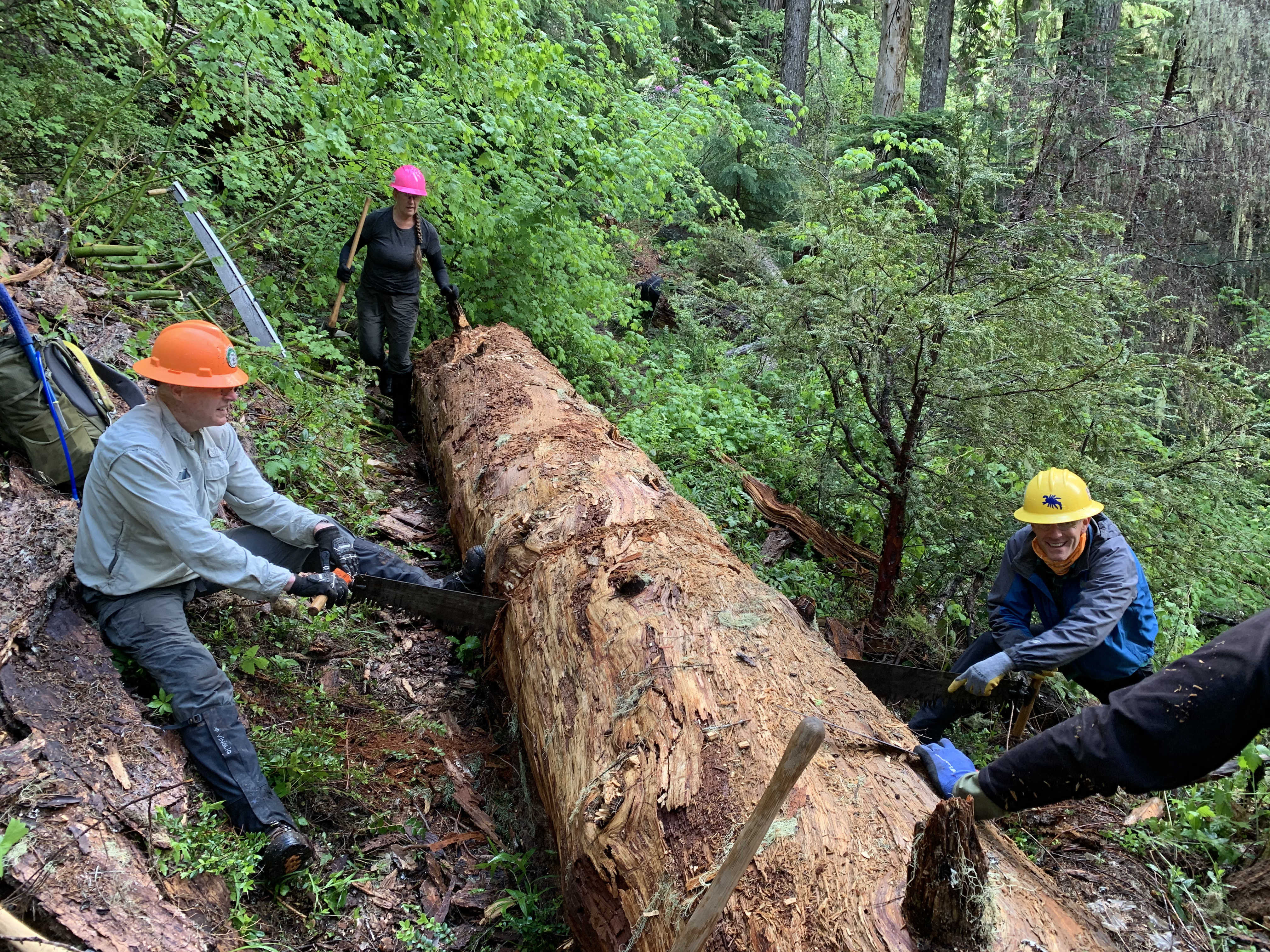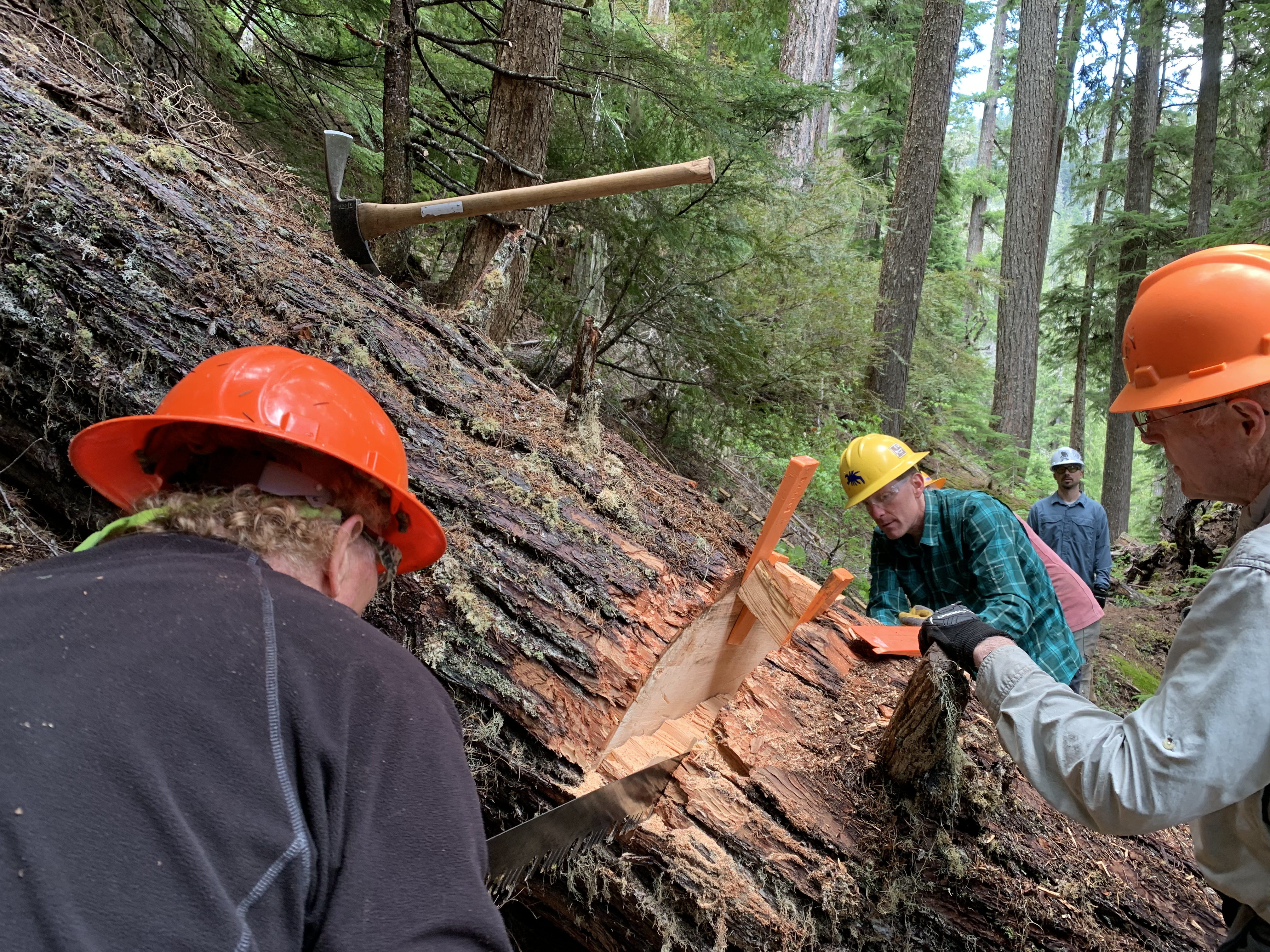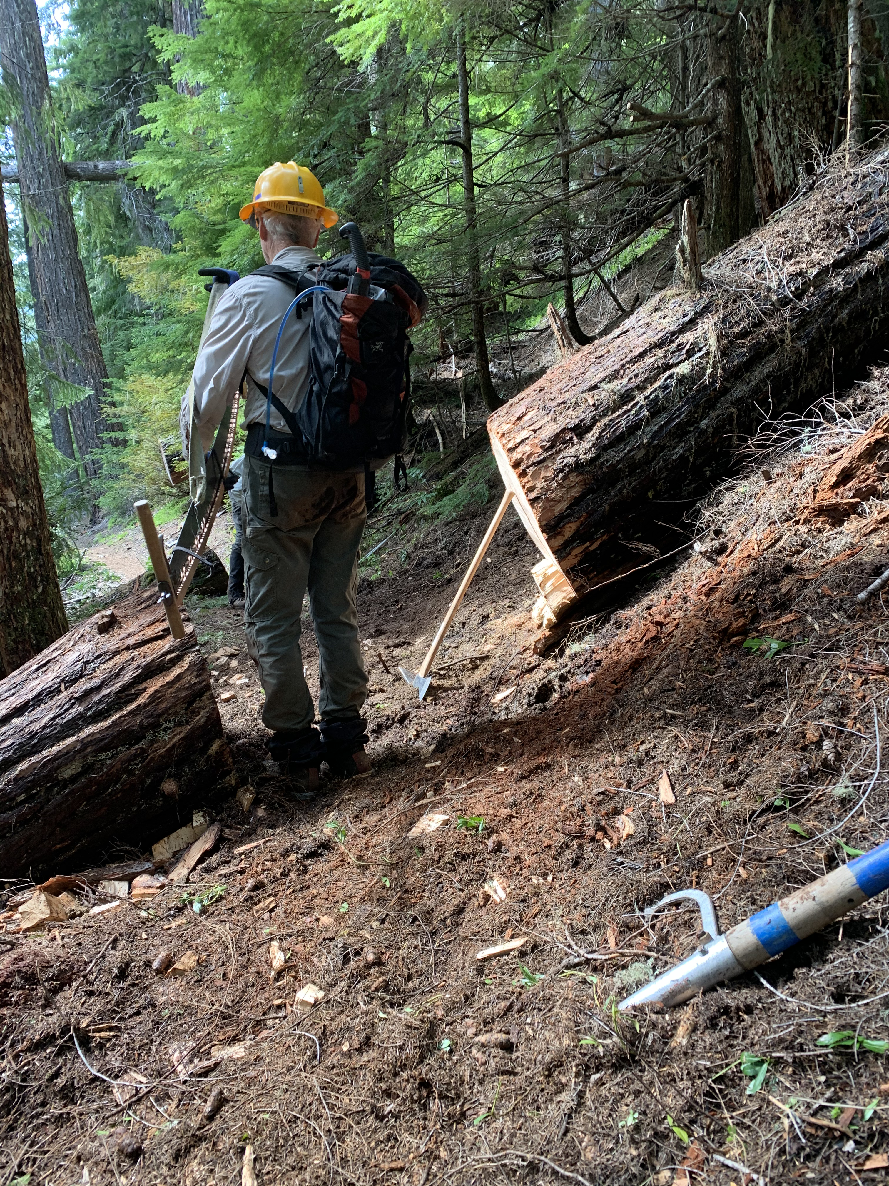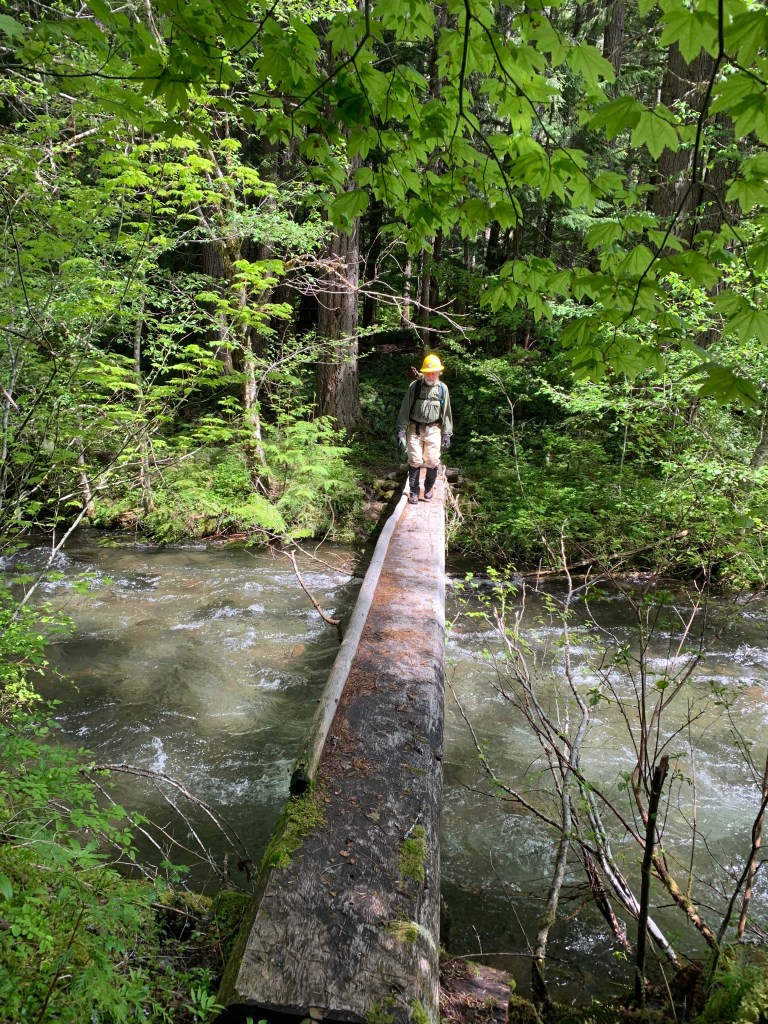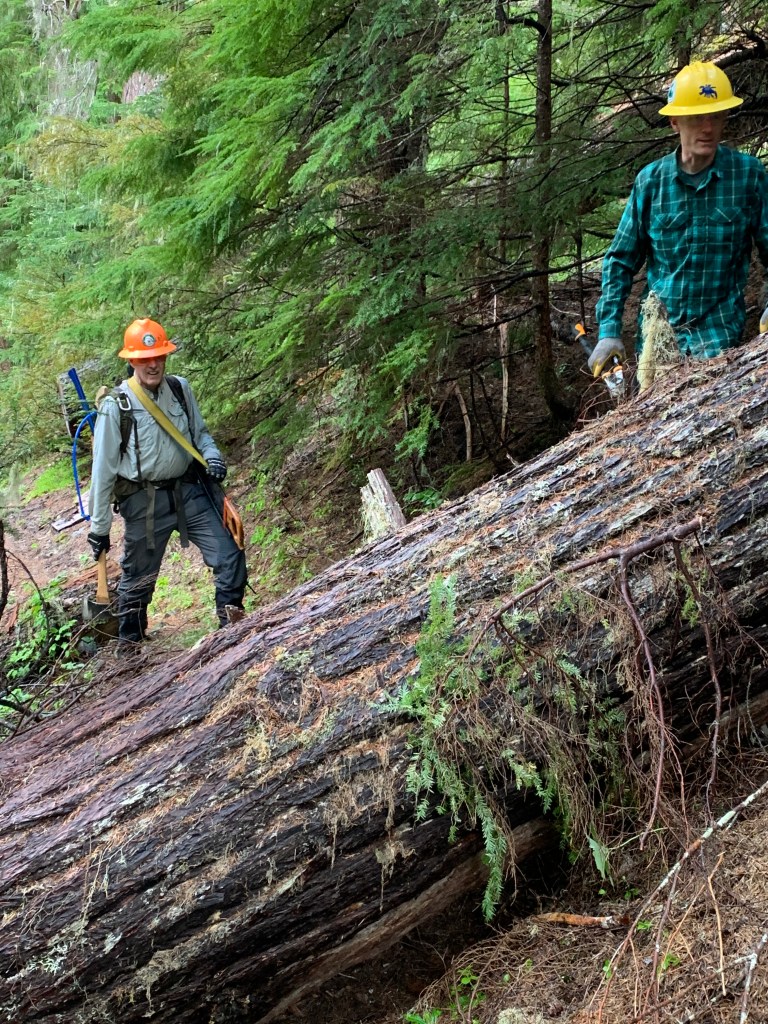 I told the crew leader for the third time that day I was going to start early, again to avoid stiffness. And for the third consecutive time, within a short distance there were two new logs that we had to cut out. After removing them, I was now in the back, but we were going downhill, so the hike became easier. At stream crossings, I looked for the shallowest place and went. I had done the same on Mt. Hood. My feet were already wet and as a canoeist, wet feet don’t bother me much. They weren’t going to dry before I finished the day, so I just kept going. And finally, the cruising speed I have after several miles of hiking started to kick in. I was still tired, but my legs worked automatically it seemed, especially downhill on a familiar trail. The crew leader later passed me; I kept him in sight for the most part and finished about 5. The others came in behind me “a few minutes” later.