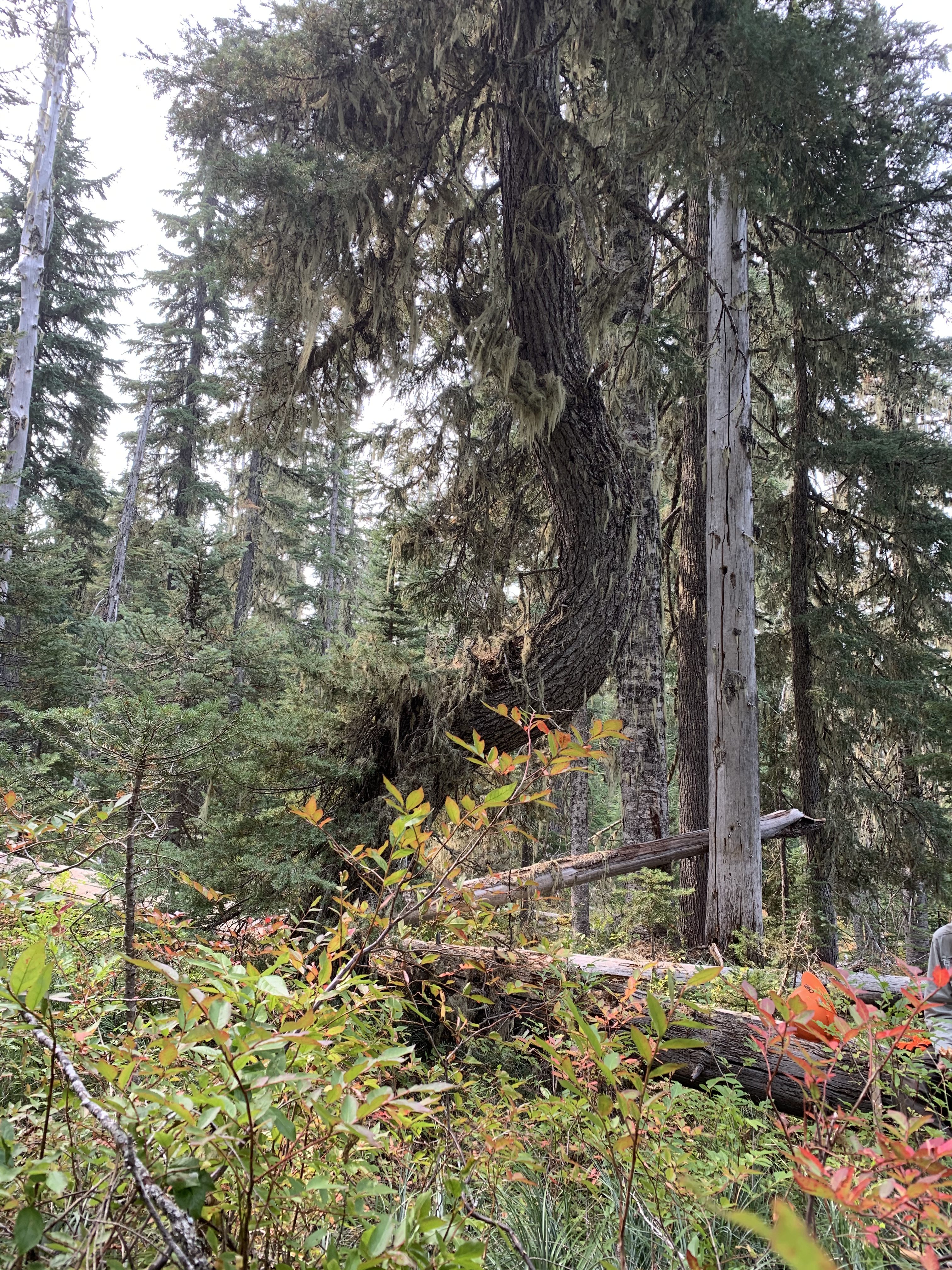 The steep section was straight up, no switchbacks, suggesting it was an old trail, since most trails switchback to prevent erosion. Again, I arrived at a log needing removal, but the crew leader behind me told me to go ahead. I was hoping he would say that. I was in the middle of the group on a steep climb recalling my 45 mile backpack around Mt. Hood, where leaving Tilly Jane going to 7000,’ I was taking 40 steps and stopping to breathe, then 40 more. This one I was making only 50 steps. Two were above me, and I had no idea how they were doing it, only that I wanted to be where they were, so I kept going, 50, stop and breathe, check the altimeter, 50 more.I reached where they were, and they were again further up. It was 600 brutal vertical feet straight up the ridge over maybe a half mile. When we reached the junction, at 3 pm, five miles yet to go, I was concerned at how slowly I did the climb. I wasn’t carrying an excessive amount of weight, my knee was behaving, and I was just doing what I could, but I felt like I was hanging on for dear life.